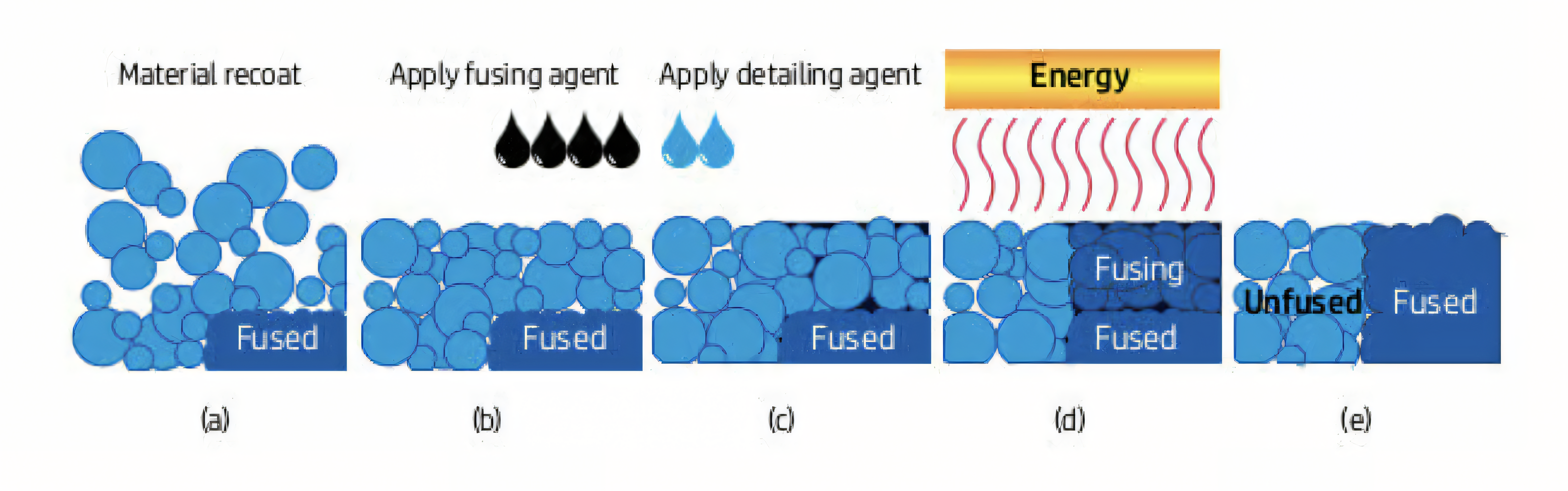 MJF printing is a form of binder jetting. Binder jetting 3D printing involves using a liquid material, jetted by an inkjet printhead, onto layers of powdered material. Traditionally, binder jetting with plastic or polymer is a "cold" process, but HP (and a few others) introduced heat into the process, which significantly changes how it works. This unique approach sometimes puts MJF in a category of its own.