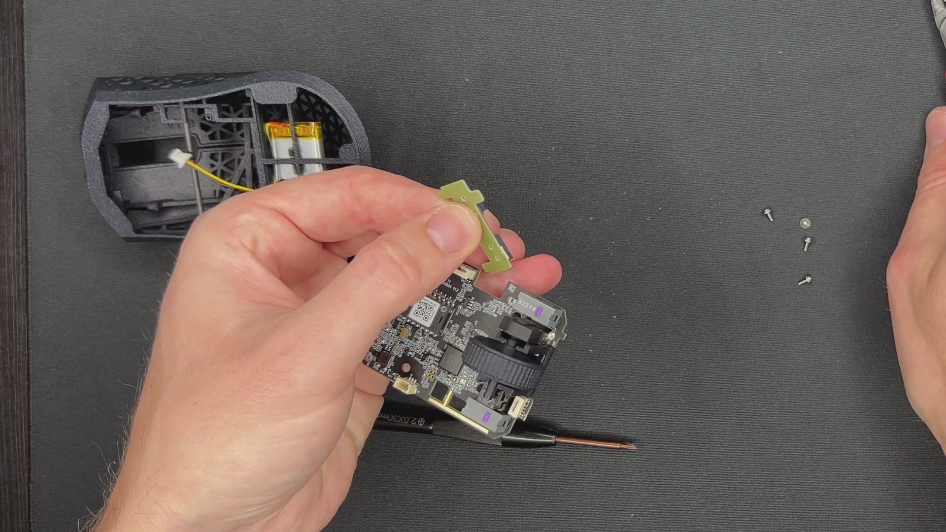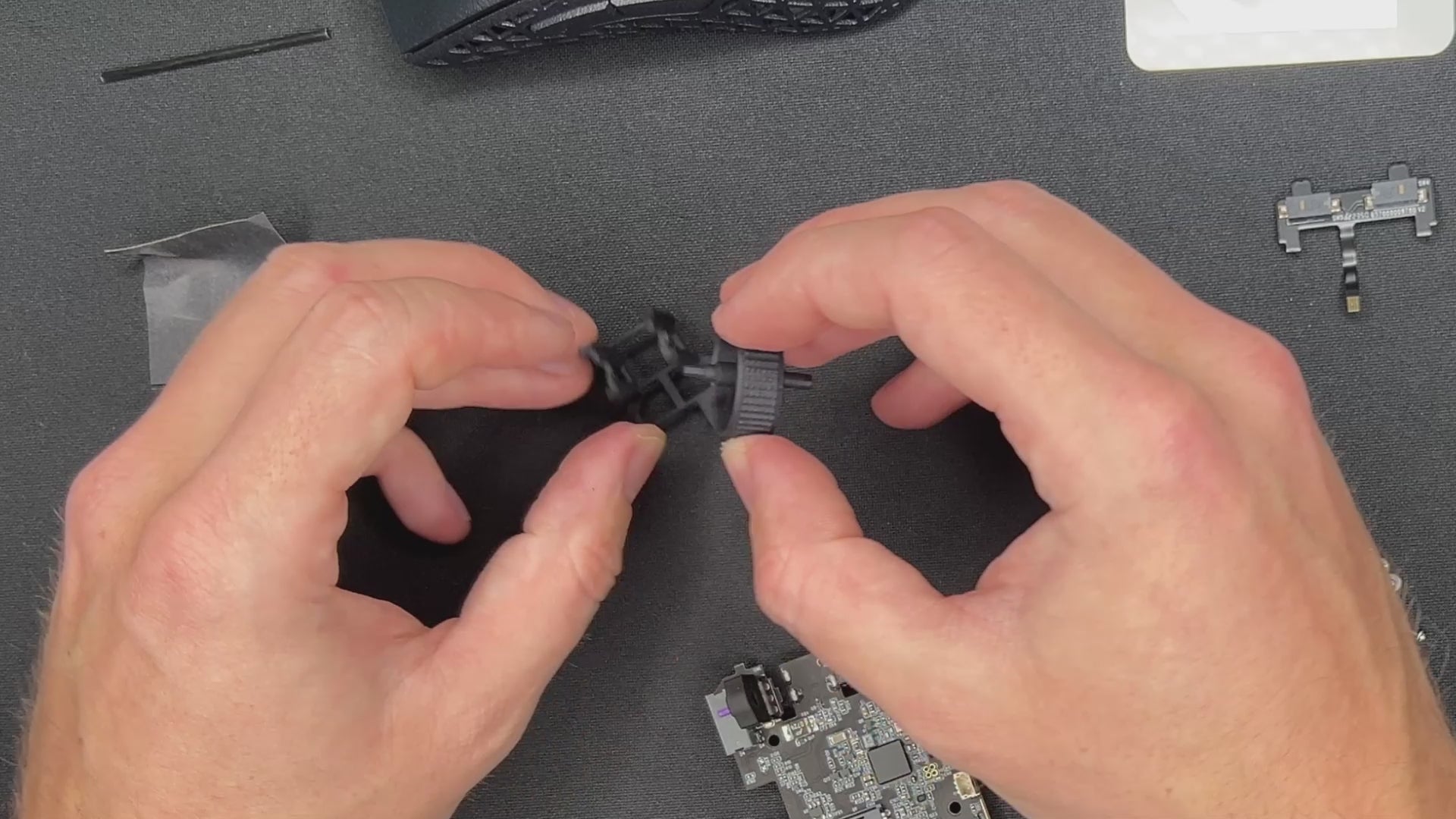 - Install the mouse wheel holder. IMPORTANT: Make sure the holder sits on top of the PCB in the front.