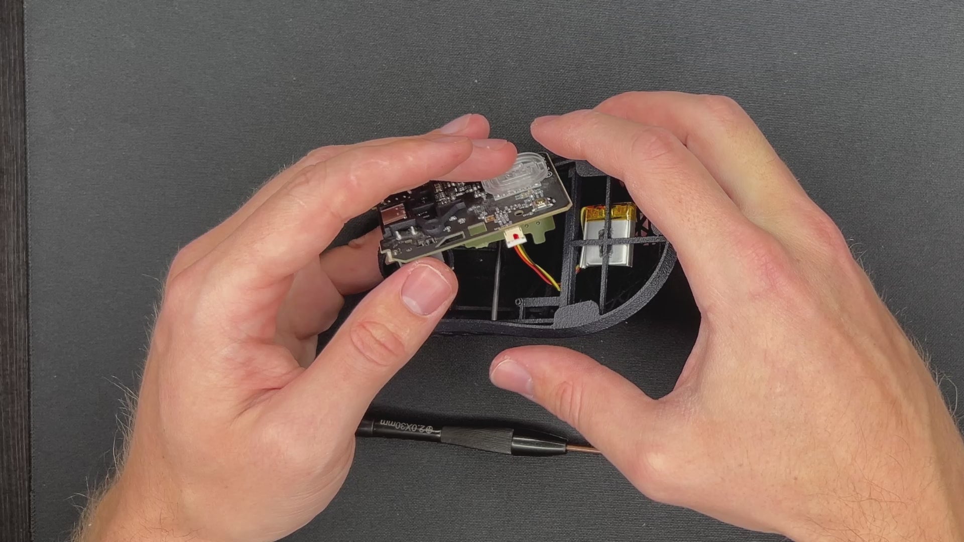 Note: Be careful where the scrollwheel is before you push the PCB down in this step. It should not push against a mouse button.