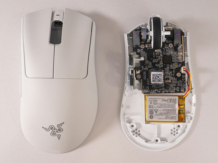 BEFORE YOU OPEN THE MOUSE: Be careful at this point. Both shells are connected with a ribbon cable in the front of the mouse.