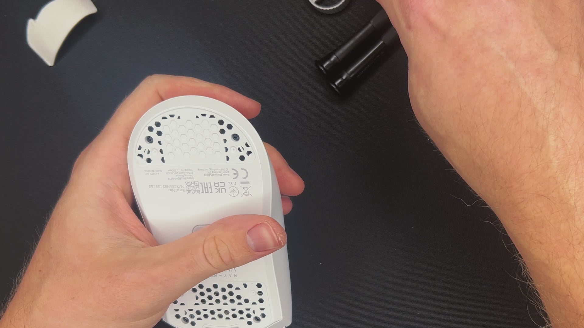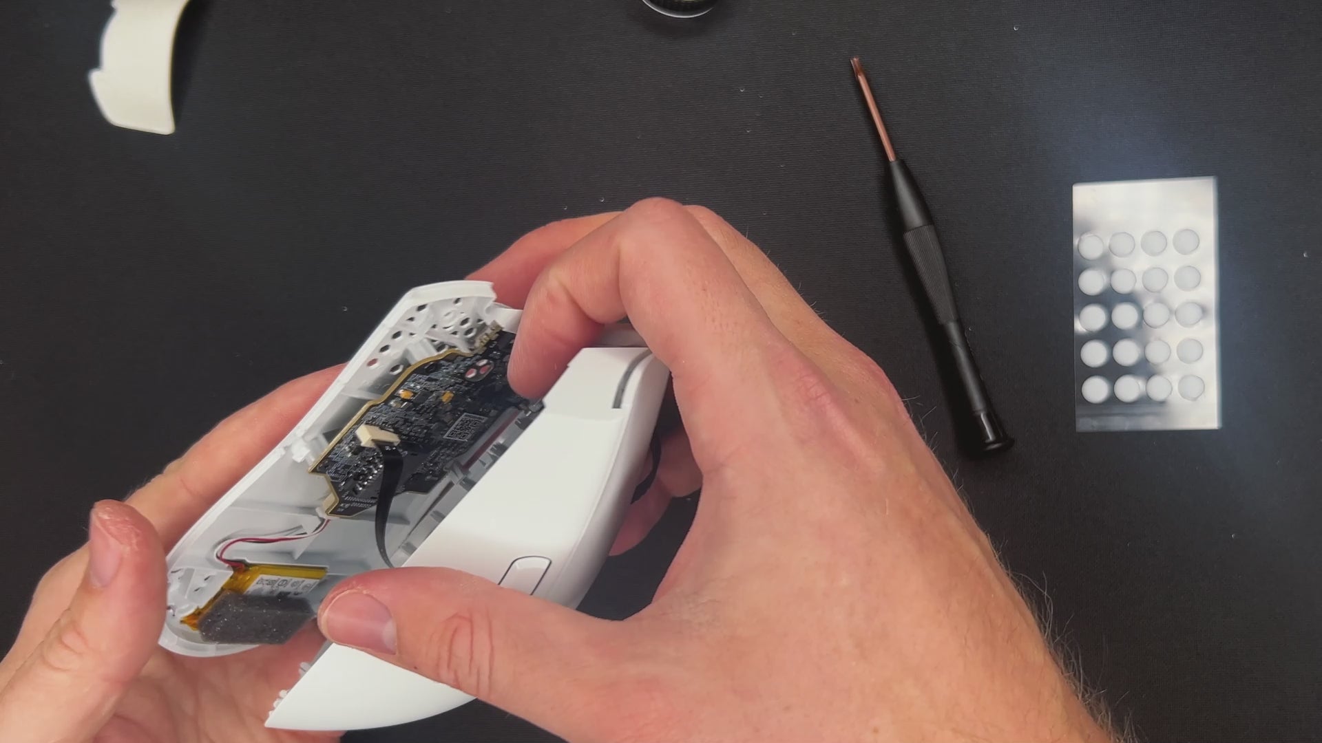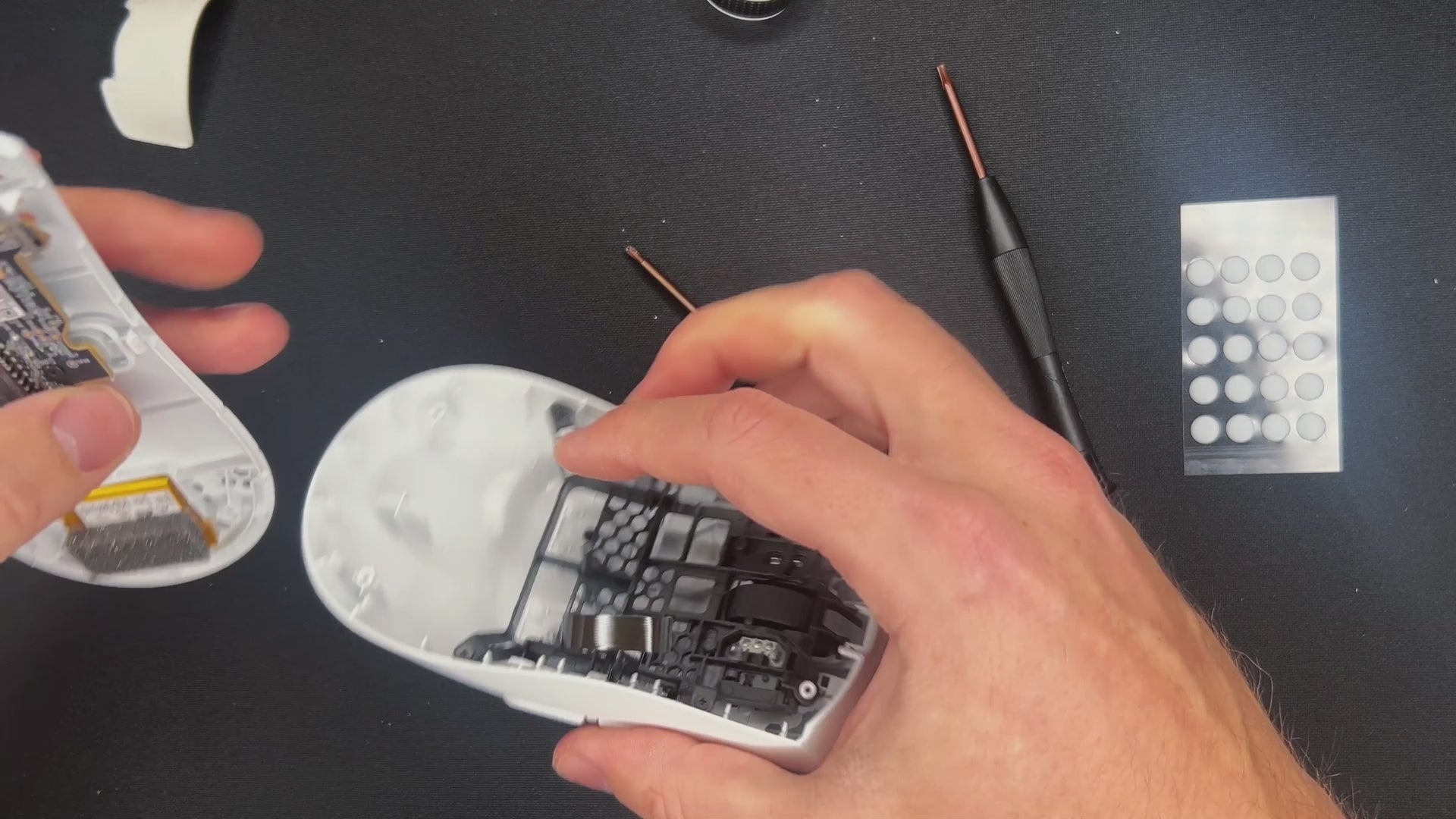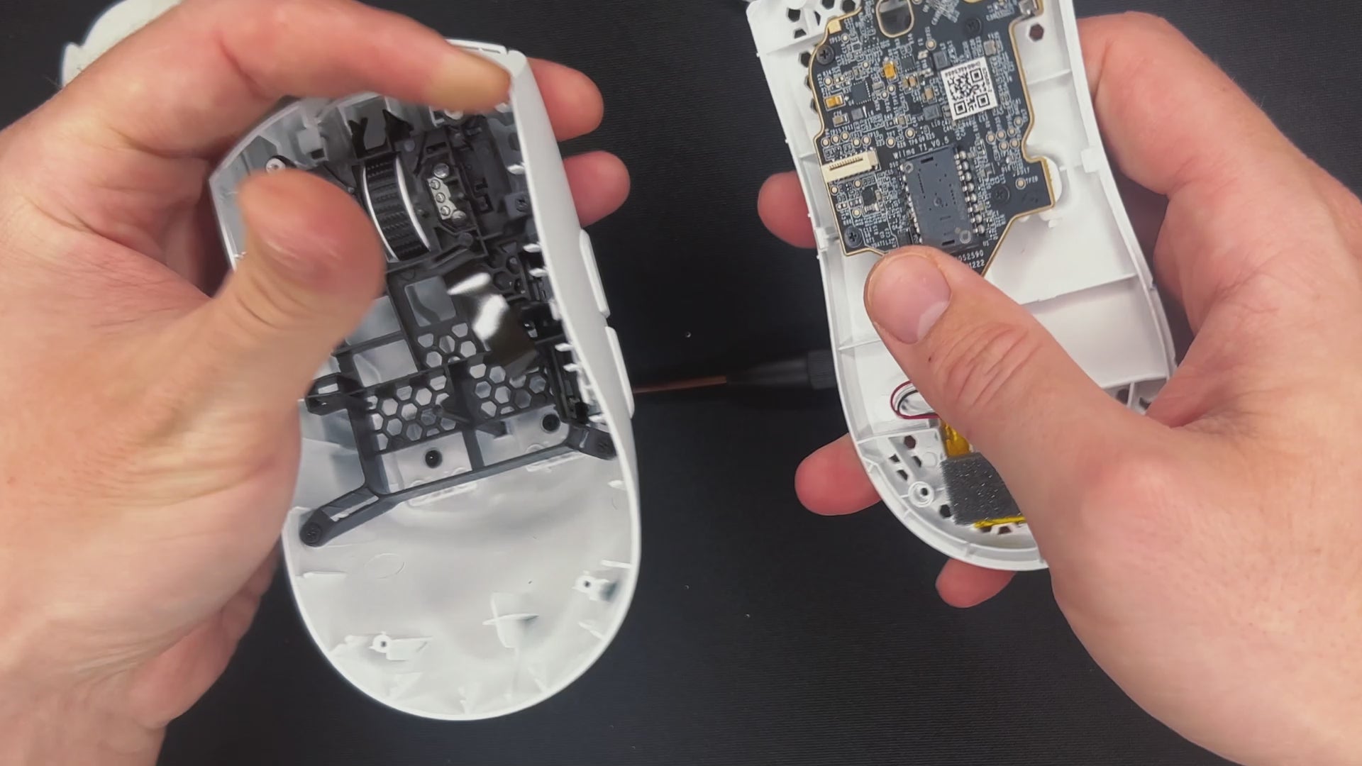 ⚠️ BEFORE YOU OPEN THE MOUSE: Be careful at this point. Both shells are connected with a ribbon cable.