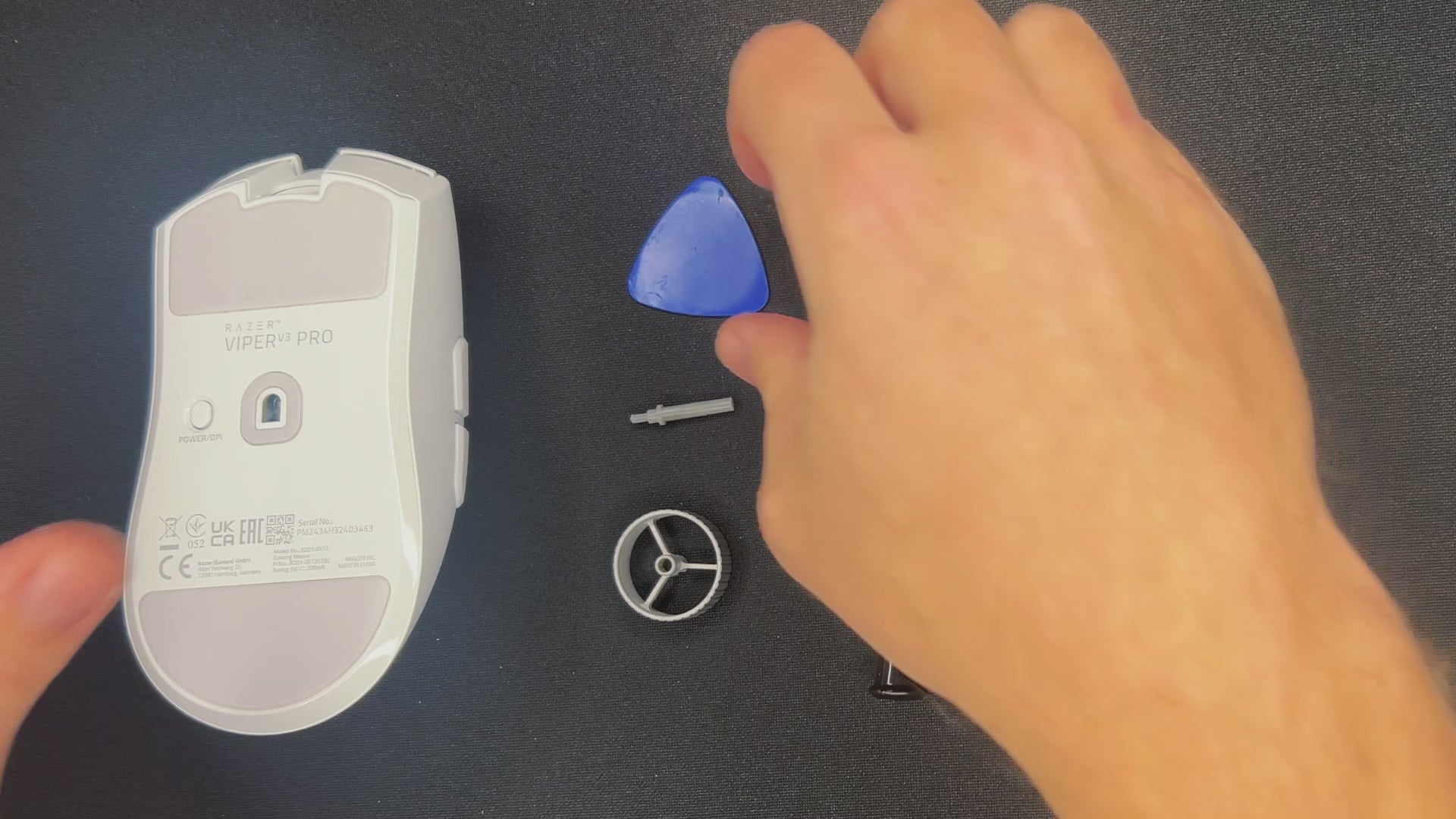 - Use a plastic pry tool or the cross screwdriver to carefully remove the PTFE mouse feet. This will expose the hidden screws beneath them.